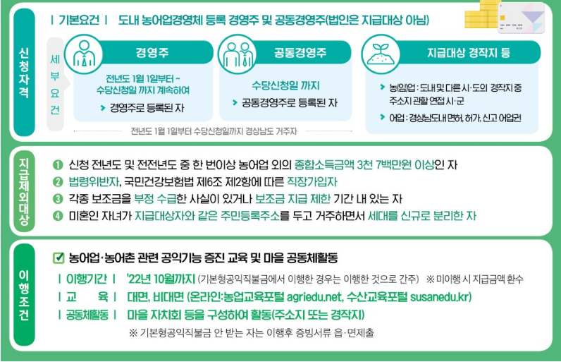 - 신청 전년도(2021년) 1월 1일부터 계속하여 경남도내 거주 및 경영체 등록 되어 있어야 함