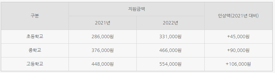 교육급여는 학생 개개인이 자율적으로 활용할 수 있도록 교육활동지원비로 지원되며, 지원 금액을 지난해보다 지원 금액을 평균 21.1% 인상하였다.
