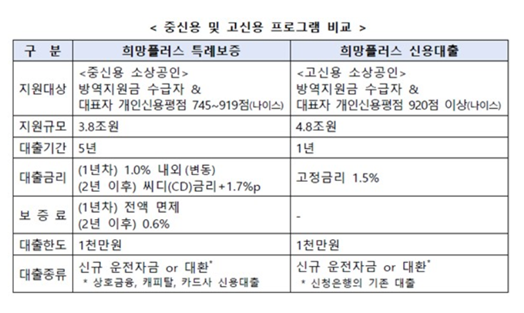 '희망플러스 신용대출'은 소상공인 방역지원금을 받은 소기업·소상공인 대표자로 개인신용평점 나이스(NICE) 기준 920점 이상인 고신용자가 대상입니다. 최대 1000만원까지 1.5% 고정금리로 제공됩니다.