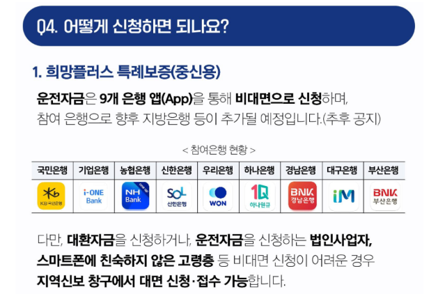 소상공인 희망대출플러스 신청 대상자는 농협·신한·우리·SC제일·하나·기업·국민·수협·대구·부산·광주·제주·전북·경남 등 14개 은행 전 지점에서 신청하면 됩니다.