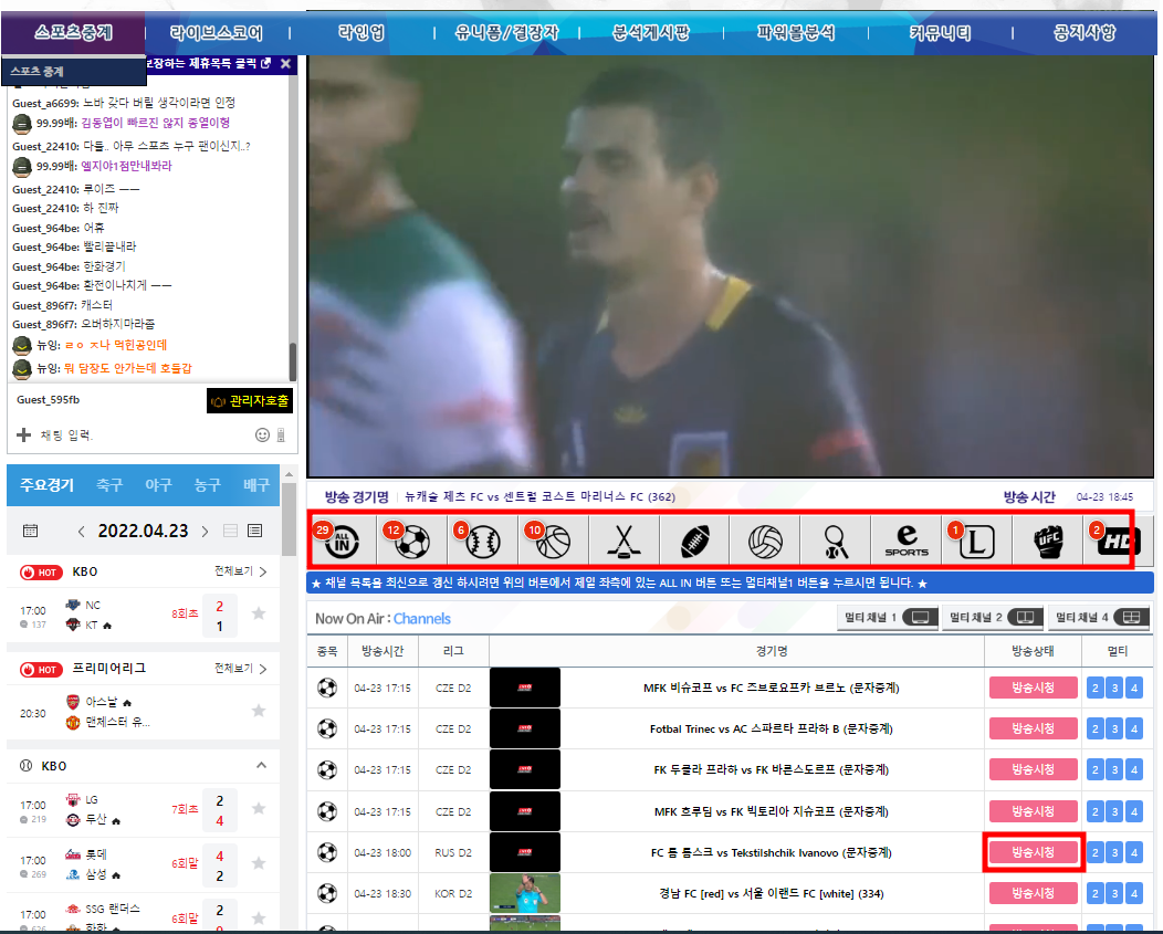 링크를 클릭하면 아래에서 축구, 야구, 보고싶은 종목 아이콘을 클릭 후 방송시청하기 클릭 하시면 동영상이 나옵니다.